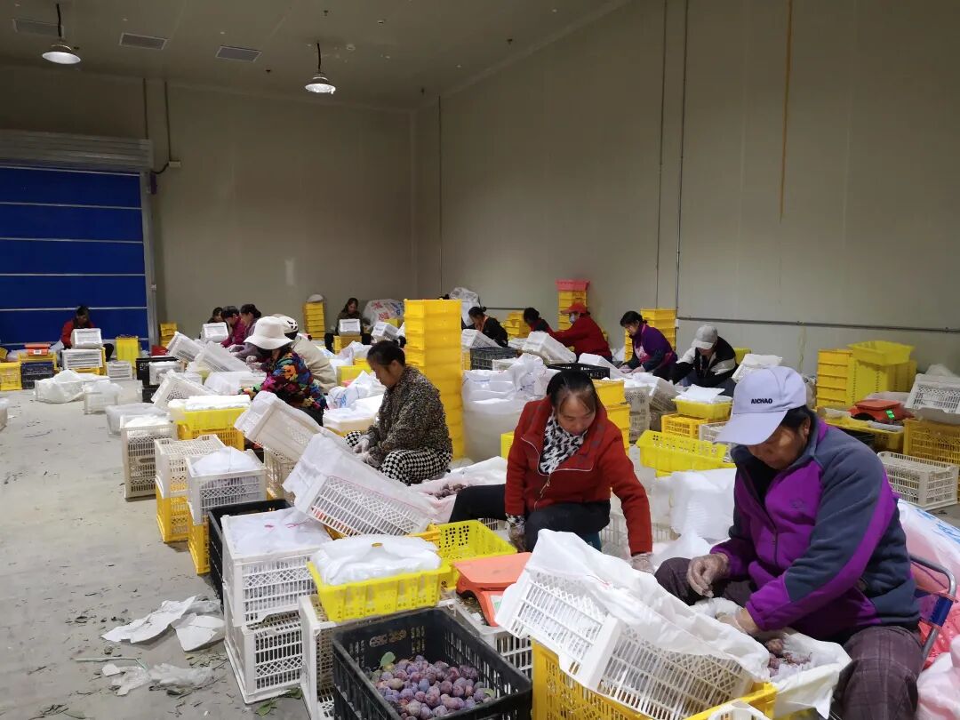 喀什地区伽师县粤伽新梅现代产业园内,附近村的村民们正在分拣西梅。钟欣 摄