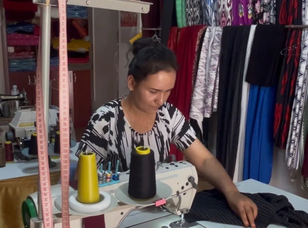 喀什地区伽师县英买里镇英买里村的维吾尔族妇女在服装店内忙碌。庞博 摄