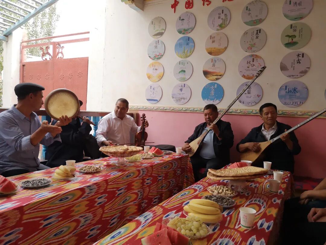 “远方的客人快下马,请你尝块伽师瓜,引你走进这绿色的家……”村民努尔麦麦提·库尔班的庭院里,一支由村民自发组成的维吾尔小乐队正在弹唱喀什地区传统民歌《麦西热甫》。吾布力卡斯木·赛丁娴熟地弹奏都塔尔,一旁的手鼓默契配合,“咚哒、咚哒”的节奏像跳跃的火焰。