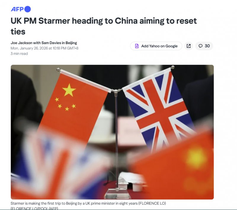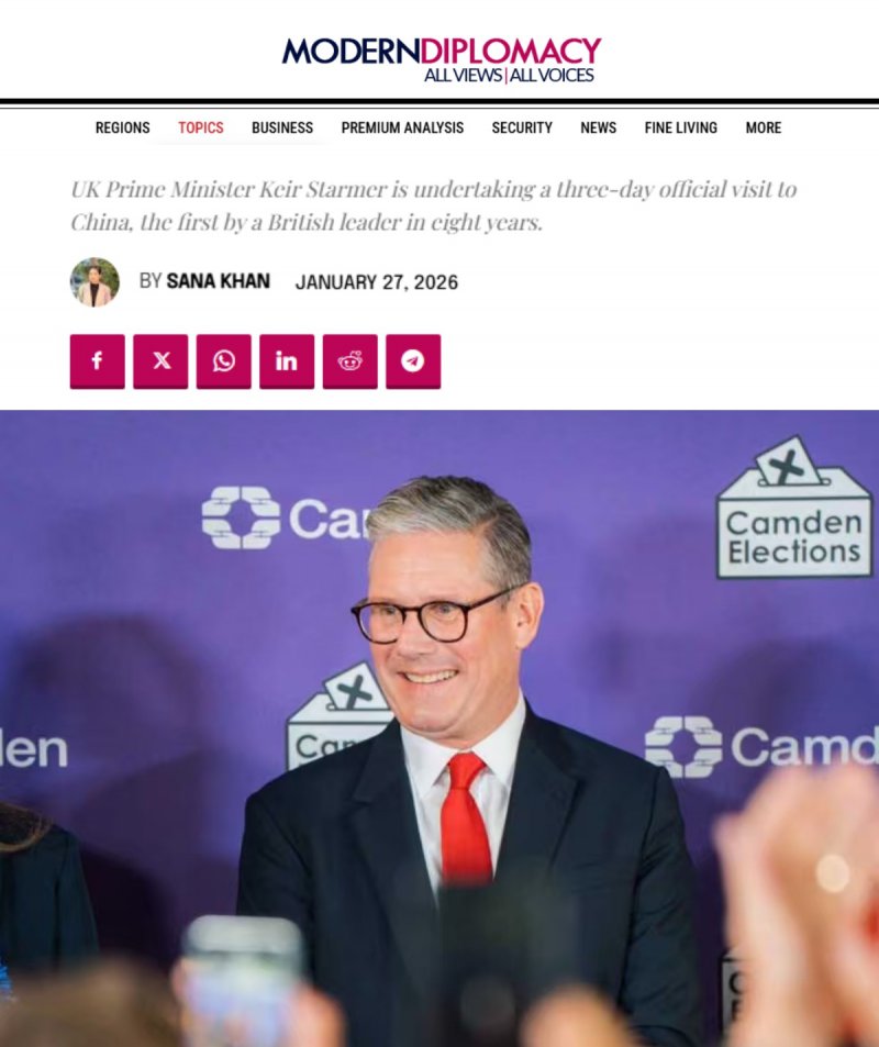 欧洲《现代外交》网站报道称,斯塔默此行标志着英国外交策略的转变,伦敦正在根据地缘政治变化重新评估其全球伙伴关系。报道称,斯塔默将探索与世界第二大经济体的经济和贸易合作途径,旨在吸引投资,扩大英国企业的市场准入,并与中国就气候变化、人工智能和公共卫生等共同全球关切展开交流。报道还分析称,此次访问展示了中等大国如何通过多元化伙伴关系来保护本国利益,以应对国际关系中系统性的不确定性。