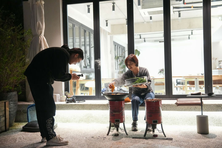 浙江省宁波市奉化区溪口镇东山村民宿主董凤洁(右)在民宿内拍摄炒年糕的短视频(2025年11月13日摄)。新华社记者 黄宗治 摄