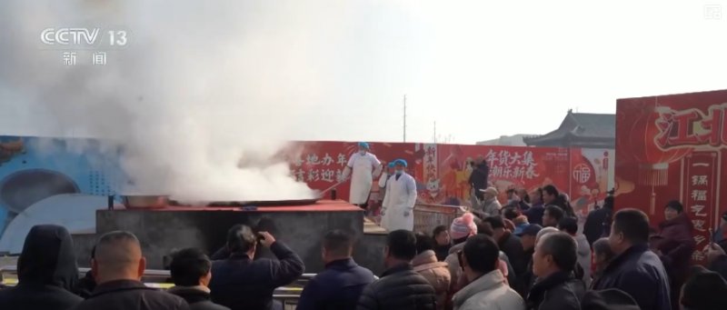 临近中午,大集上一口直径三米的巨型大锅热气蒸腾。工作人员分工协作,将2000碗香喷喷、热腾腾的羊肉汤免费送给赶集的群众。