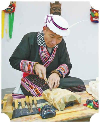 田虎塔在制作曹盖面具。
