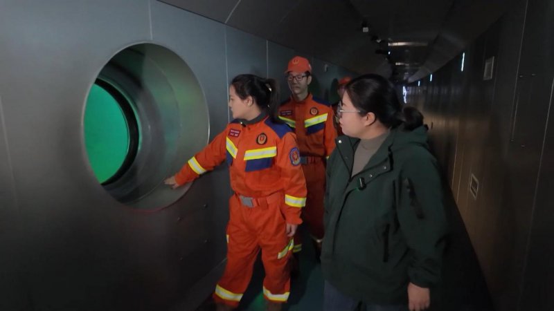 减压舱位于参观通道的一侧,不时就有游客通过。趁游客量少的时候,赵春霞和队友赶紧换好潜水服,接通了水下电话线路和空气软管。紧接着,她和另外两名队友爬进了减压舱,老队员刘吉强则在舱外负责后勤保障以及作业指挥。