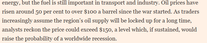 文章称,从运量来看,如果霍尔木兹海峡长期阻断,可能会引发比上世纪70年代更严重的石油危机。如今,尽管全球经济对石油能源的依赖度有所下降,但石油在交通运输和工业生产领域仍占据重要地位。文章指出,自美以对伊朗发动军事打击以来,国际油价已飙升约50%,突破每桶100美元。随着该地区的石油供应长期受阻,分析师预计油价可能将突破每桶150美元,而这一高位油价如果持续,全球经济陷入衰退的概率将大幅上升。