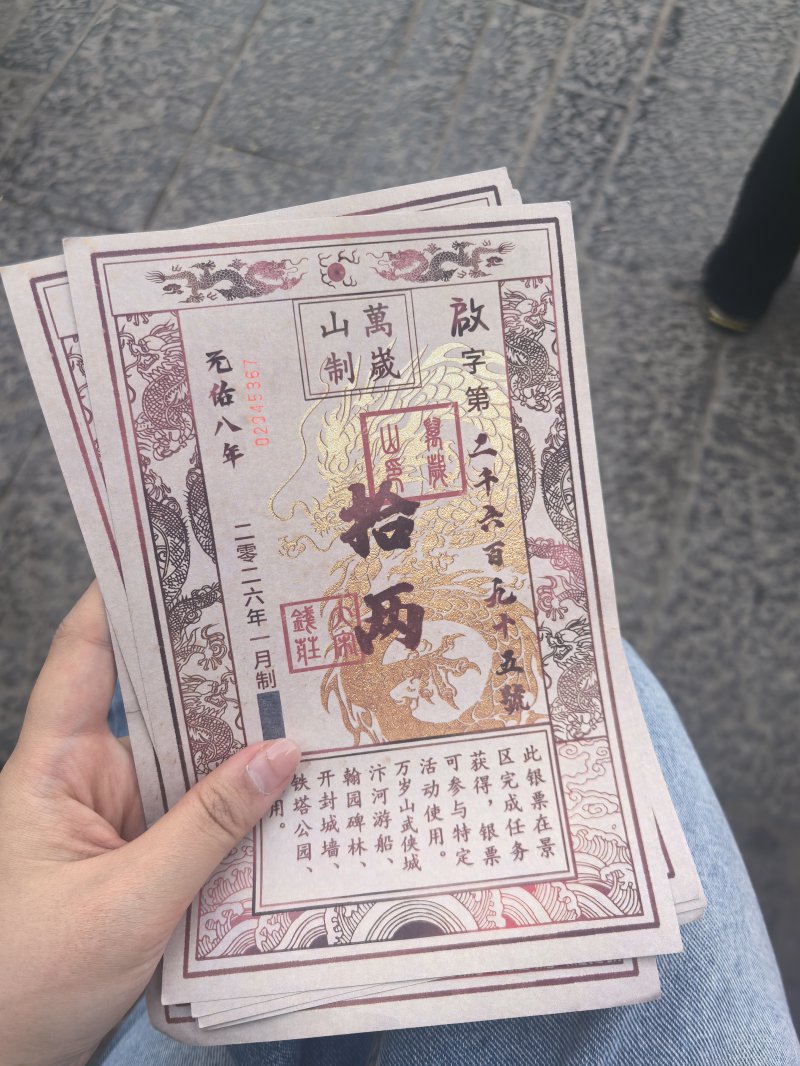 此外,万岁山武侠城首创的银票玩法,也为游客增添了别样的乐趣。游客在游玩过程中可以通过互动获得银票,凭借银票还能到货郎处兑换丰富礼品,这种独特的互动机制极大地提升了游客的参与度和沉浸感。