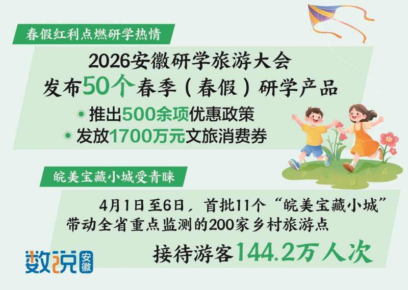 春假红利点燃研学热。2026安徽研学旅游大会为假期预热,发布50个春季(春假)研学产品,推出500余项优惠政策,发放1700万元文旅消费券,全面点燃亲子游、研学游等出游热情。合肥市推出“百万亲子春游合肥”活动,大批研学团队走进科学岛、科大讯飞、比亚迪科技园等,近距离感受硬核科技魅力。淮北夔牛天街吸引游客5万人次观看巨型机械夔牛巡游,参与“从发电厂到万家灯火”研学课程。黄山风景区推出“研学护照”,让学生于奇松怪石间寻找课本中的风景。琅琊山举办“醉翁山水间 琅琊研学行”一日营主题活动,接待游客10.4万人次,其中亲子家庭占比超60%。安庆倒扒狮历史文化街区举办花朝节活动,吸引游客4.8万人次欣赏黄梅戏、体验国潮风。安徽博物院推出“安徽古代文明——史前时期的安徽”陈列展,接待游客4.4万人次。