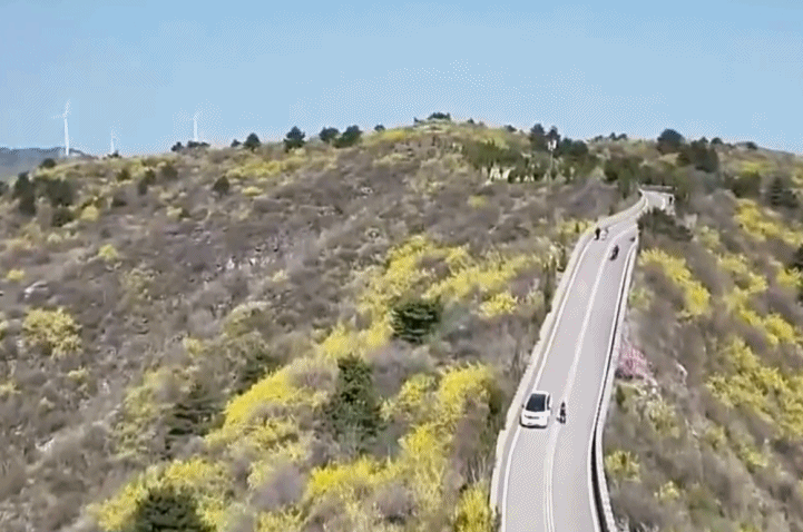眼下,在河南新乡卫辉市太行山区,万亩野生连翘迎来盛花期,漫山金黄铺满山峦,秀美风光吸引了各地游客观光游览、打卡拍照。