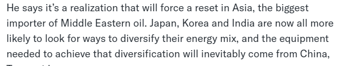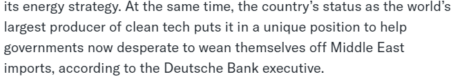 彭博社4月9日发表的文章援引德意志银行新兴市场首席投资官的话说, 中国作为全球最大的清洁技术生产国,在帮助各国政府摆脱对中东石油进口的依赖方面具有独特的优势,其设备也必将用于能源结构多元化。