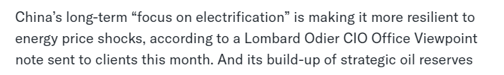 文章认为,过去十年的可再生能源建设与电气化进程,已显著降低了中国遭受能源冲击的风险。巴克莱银行说,随着风能和太阳能使用规模的扩大,中国电力结构趋于多元化。报告援引瑞士隆奥银行首席投资官办公室本月的一份报告认为,中国长期以来“着力推进电气化”使其更能抵御能源价格冲击。