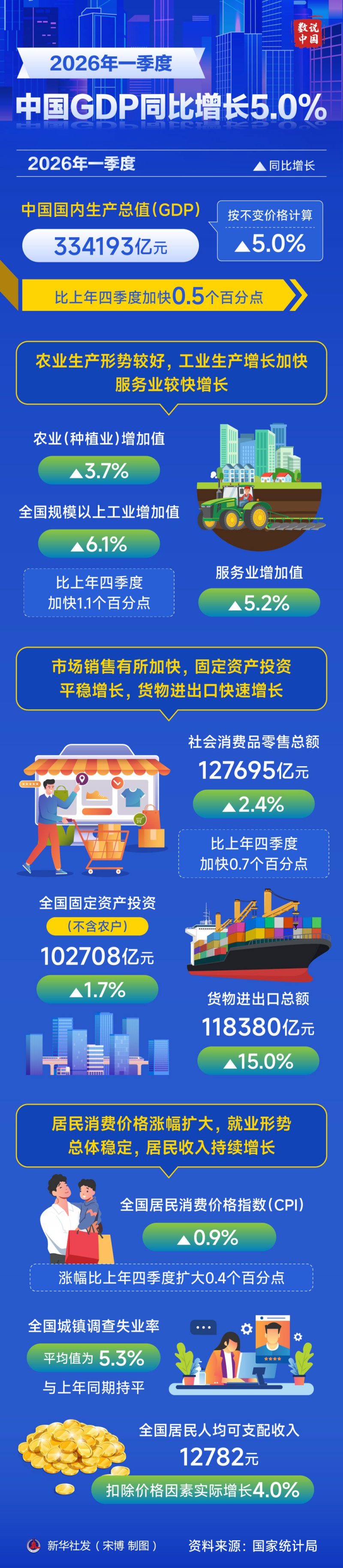 4月16日,中国经济“首季报”公布:国内生产总值(GDP)334193亿元,同比增长5.0%。