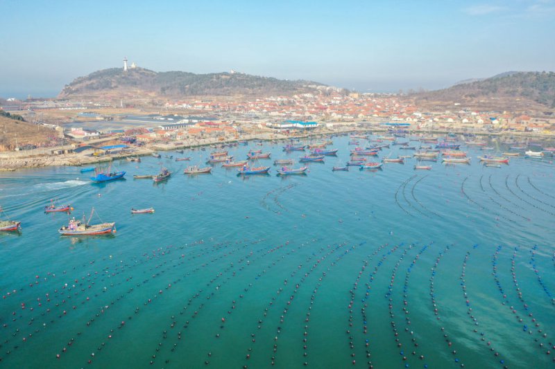 养殖工人驾驶船只在长岛海域养殖区内生产作业(无人机照片)。新华社记者 朱峥 摄