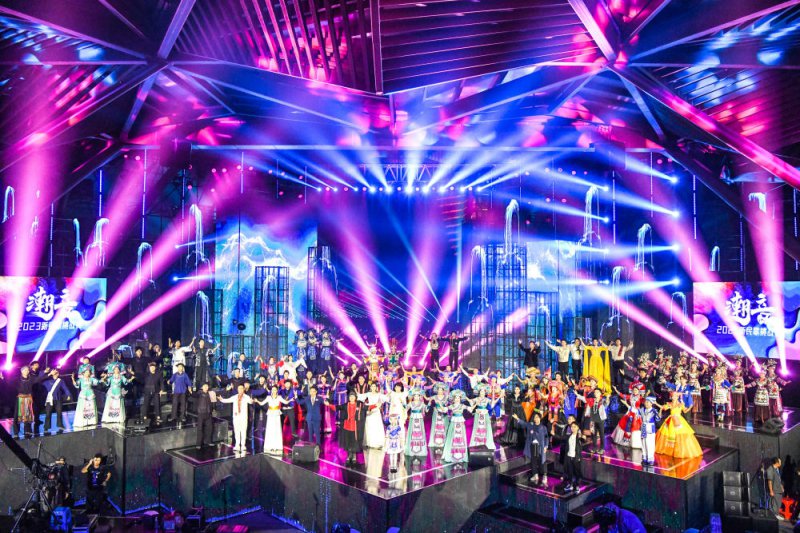 这是2023年5月9日在广西南宁园博园演艺中心拍摄的“潮音·2023新民歌挑战赛”总决赛比赛现场。此次比赛吸引了来自国内外1500多组选手报名参赛,收到各类新民歌作品1608件,有效丰富了广西特色的民歌文化。