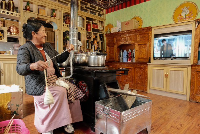 图为朗县仲达镇卓岗村村民正在家中搓毛线、看电视。记者 谢筱纯 摄