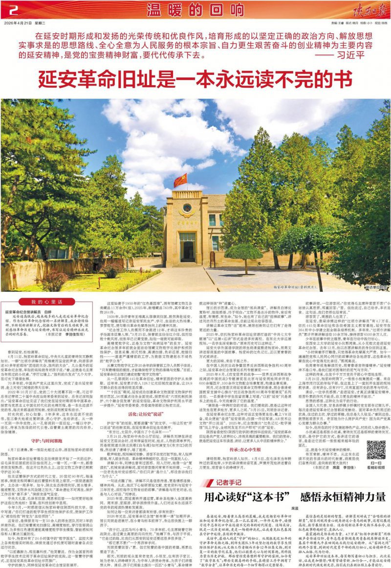 延安革命旧址这本书,每页都写着初心与担当。此次采访,让我更加懂得:唯有常读常新、知行合一,才能让延安精神在新时代焕发新光芒,指引我们在新征程上奋勇前行。(席晨)