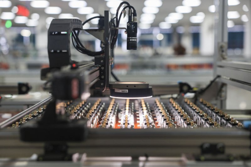 在江苏省靖江市西来镇的江苏沙龙机电科技有限公司生产车间内,电子元件自动检测线正开展检测作业。新华社发(顾继红 摄)