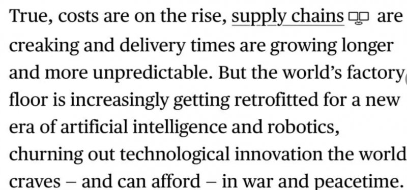 报道说,当前全球运输成本不断上涨,供应链不堪重负,交货周期越来越长且难以预测。但中国生产体系正不断进行改造,以适应人工智能和机器人技术的新时代,并源源不断地生产出全世界都需要且负担得起的创新产品。