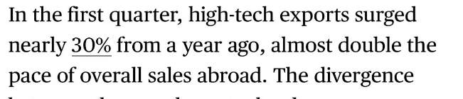 报道指出,人工智能投资的迅猛增长正成为推动科技出口的关键动力。据渣打银行估计,2025年,中国已成为全球最大的人工智能相关产品供应国,销售额超过7000亿美元。除了人工智能之外,从工业机械到电动汽车等创新型高附加值产品也可能在未来几个月内保持中国出口的强劲势头。