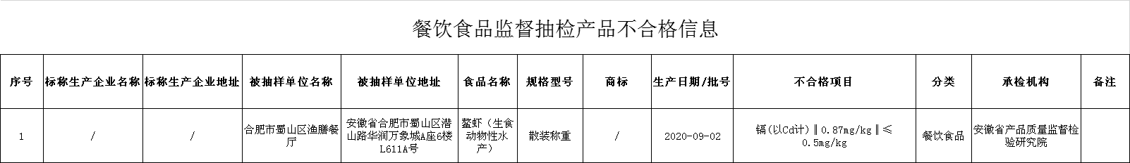(一)合肥市蜀山区渔膳餐厅销售的鳌虾(生食动物性水产),镉(以Cd计)不符合食品安全国家标准。检验机构为安徽省产品质量监督检验研究院。