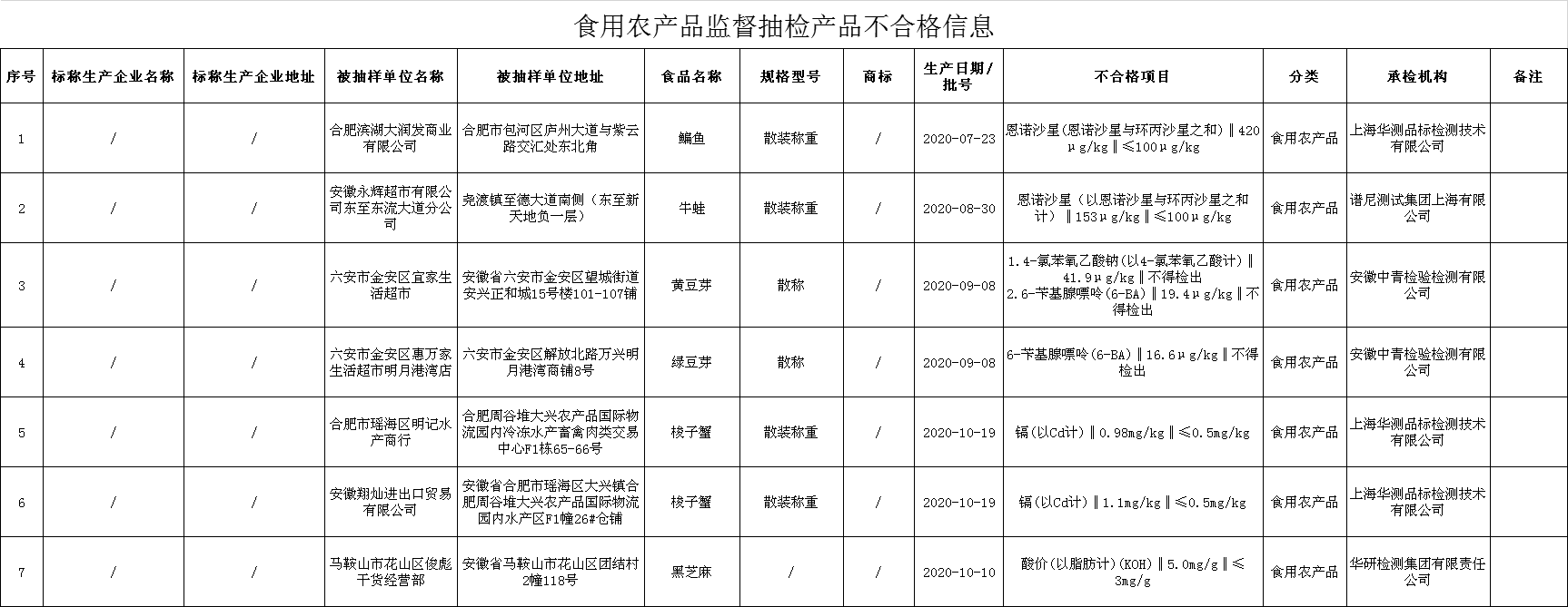 (二)合肥市瑶海区明记水产商行销售的梭子蟹,镉(以Cd计)不符合食品安全国家标准。检验机构为上海华测品标检测技术有限公司。