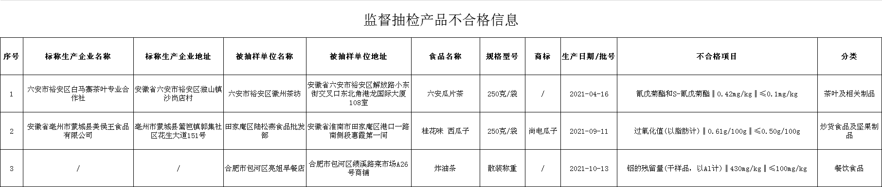 1月5日,安徽省市场监督管理局发布公告,组织抽检茶叶及相关制品、炒货食品及坚果制品、餐饮食品、方便食品、粮食加工品等5类食品375批次样品。根据食品安全国家标准检验和判定,其中抽样检验项目合格样品372批次、不合格样品3批次(见附件)。